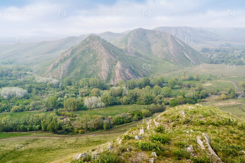 Вид на весенний горный пейзаж сквозь туманную дымку. Андреевские конусы. Фото сделано возле села Андреевка, Оренбургская область, Россия