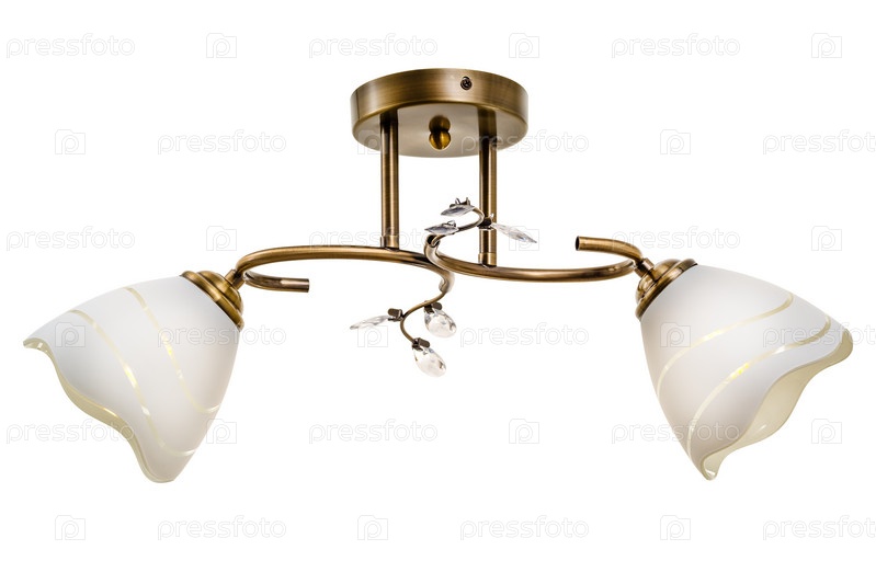 Бронзовый двухламповый плафон с белыми цветочными плафонами, орнаментированными поперечными волнообразными полосами. Изолированные на белом фоне