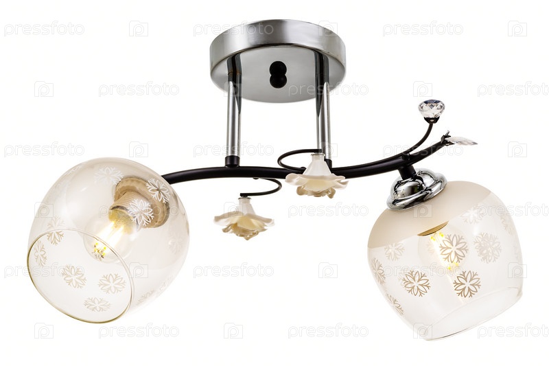 Черный двухламповый потолочный светильник с хромированным основанием, белыми цветами и хрусталем. Изолированные на белом фоне