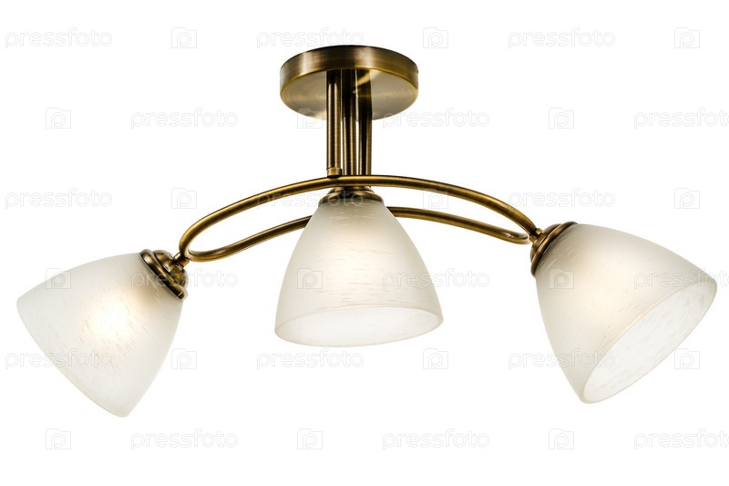Трехламповая бронзовая люстра с белыми матовыми плафонами. Изолированные на белом фоне