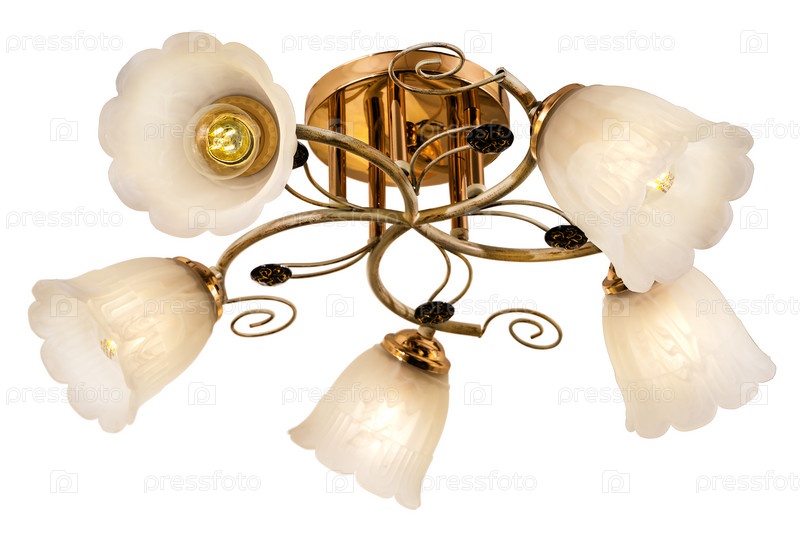 Белая пятиламповая люстра с золотым основанием и матовыми плафонами в форме цветов. Изолированные на белом фоне