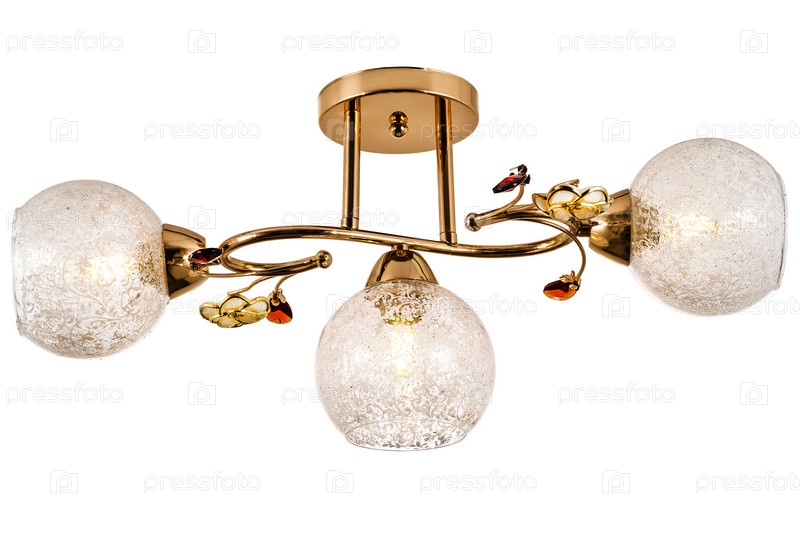 Люстра трехламповая с плафонами из матового стекла с цветочным узором. Изолированные на белом фоне