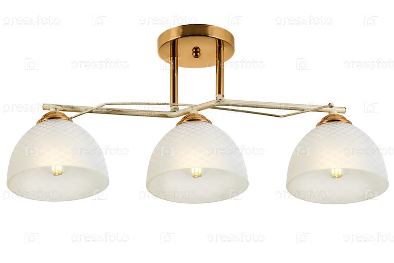 Белая трехламповая люстра с золотым основанием и белыми матовыми плафонами с геометрическим орнаментом. Изолированные на белом фоне