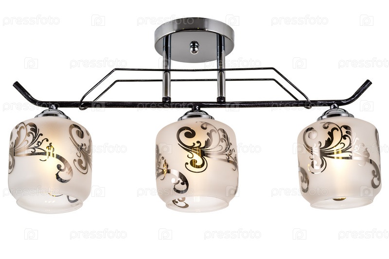 Люстра трехламповая с плафонами из матового стекла с цветочным узором. Изолированные на белом фоне