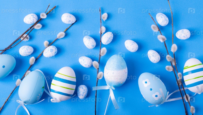Синий пасхальный фон с декоративными яйцами и ветками ивы. Праздничная плоская планировка. Монохромный