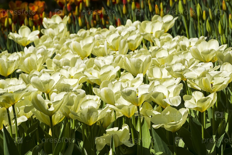 Красивые светло-желтые тюльпаны на ярком весеннем солнцем