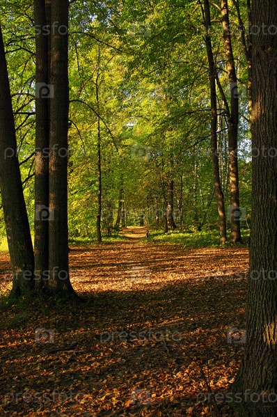 Полоски света и тени на опавшей листве на тропинке в осеннем лесу. Начало сентября. Битцевский лесопарк, Москва, Россия
