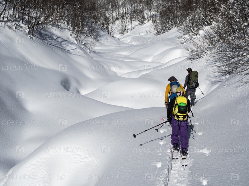 Активные мужчины ходят на лыжах или сплитбордах по снегу. Лыжный туризм