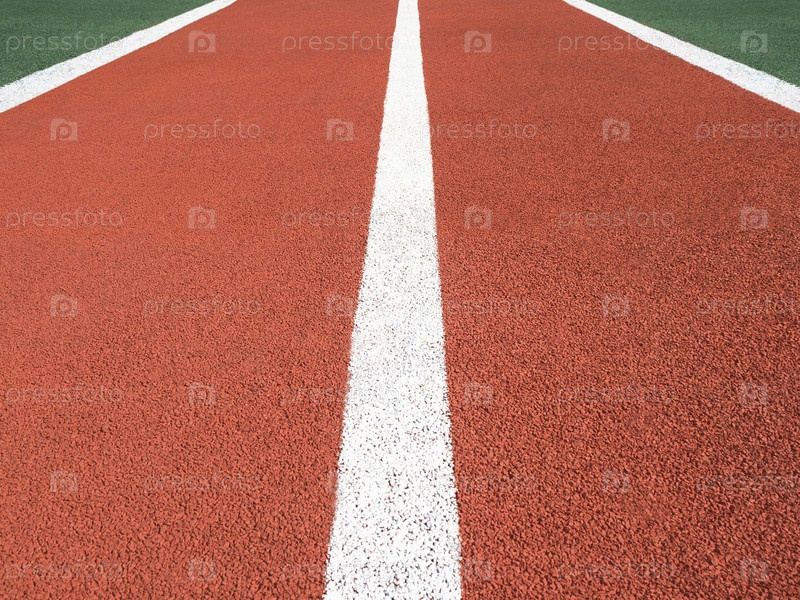 Перспективный вид красной беговой дорожки с белыми линиями. Спортивный фон