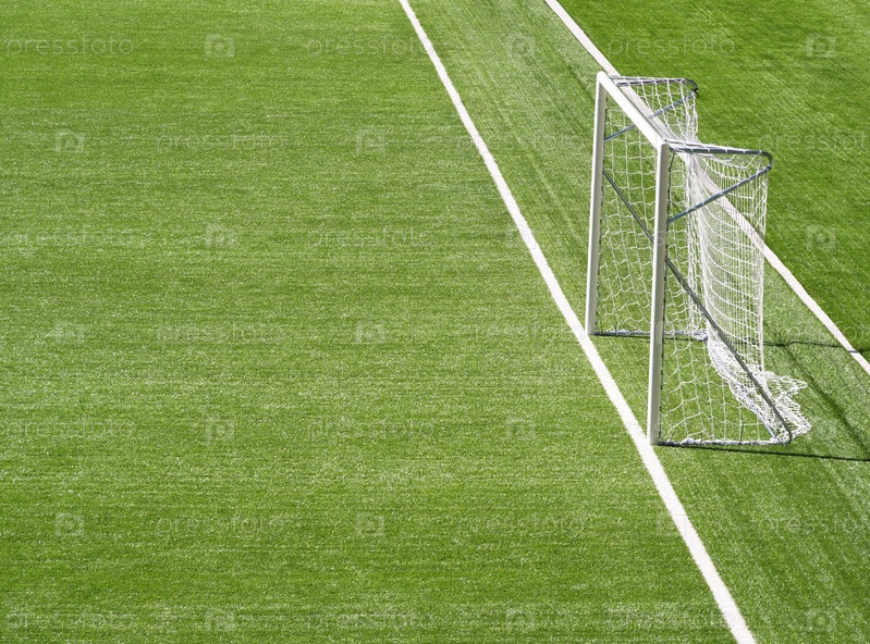 Переносная стойка ворот на фоне футбольного поля с копировальным пространством