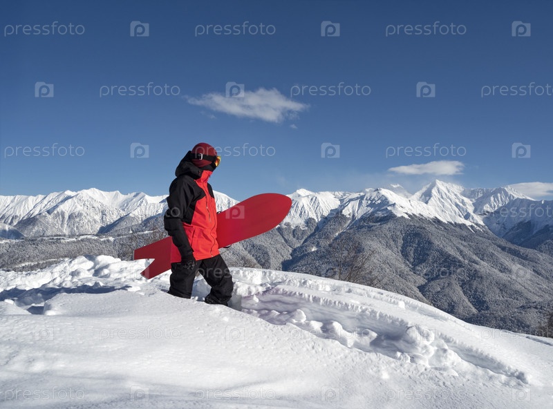 Молодой активный человек со сноубордом, стоящий в рыхлом снегу на фоне гор на горнолыжном курорте Роза Хутор