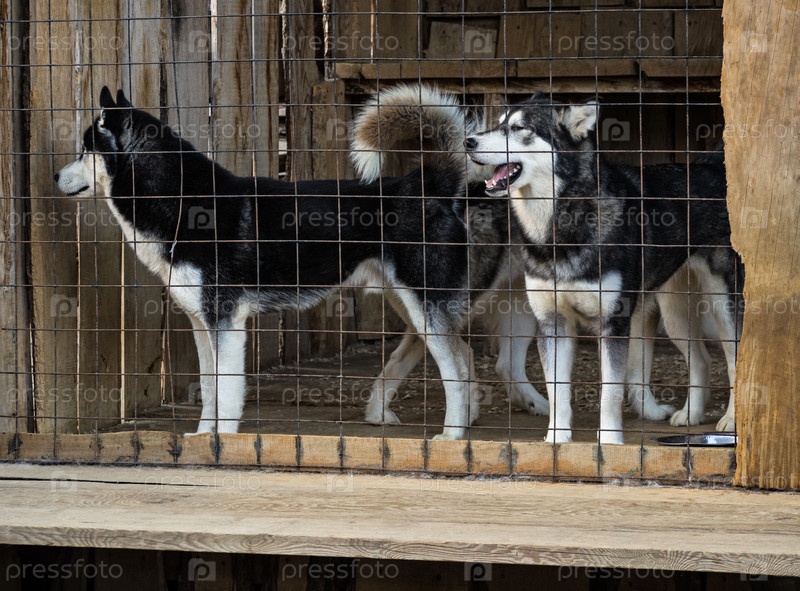Две черно-белые хаски в собачьей конуре
