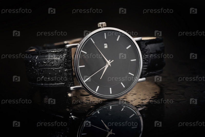 Наручные часы с кожаным ремешком на черном фоне, крупным планом