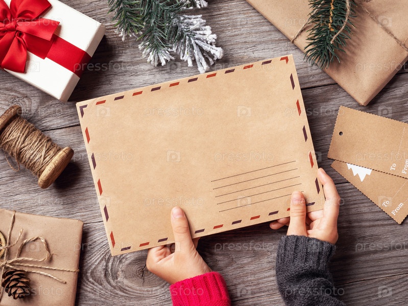 Ребенок держит в руках конверт с письмом Деду Морозу на фоне елочных украшений, шаблон для дизайнера