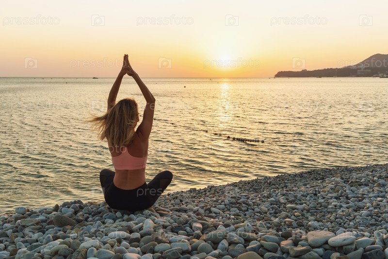 Женщина в спортивной одежде, практикующая йогу, медитирует с поднятыми руками, сидя в позе лотоса на галечном берегу летним солнечным вечером