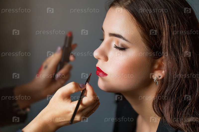 Визажист наносит красную помаду на молодую красавицу. Девушка делает макияж