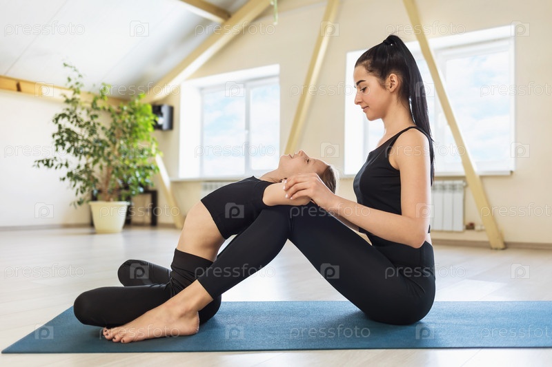 Маленькая девочка занимается йогой с частным тренером в студии. Молодая красивая женщина-тренер помогает ученику выполнять упражнения для позвоночника, сидя на гимнастическом коврике