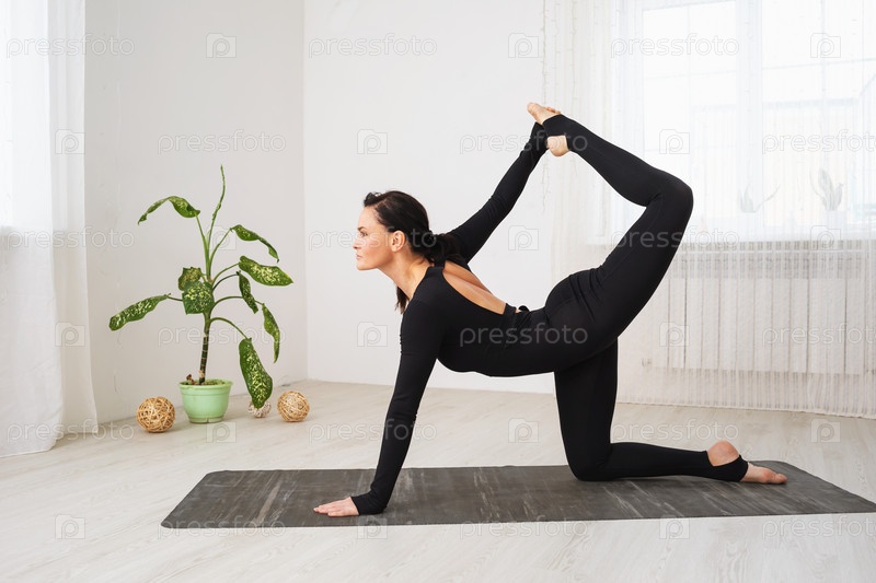 Женщина в черной спортивной одежде занимается йогой, выполняет упражнение Ардха Дханурасана, позу полукруга, тренируется на коврике в комнате у окна