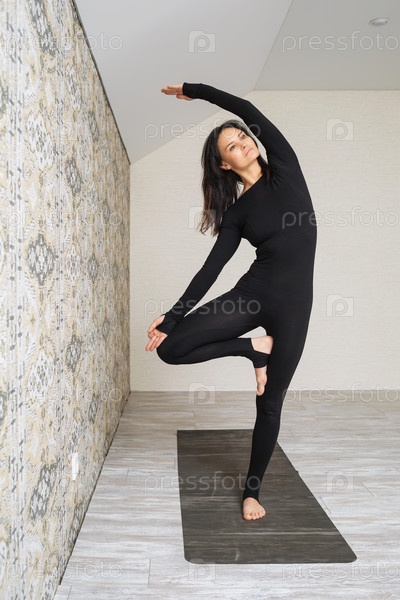 Женщина в черной спортивной одежде занимается йогой, выполняет вариации упражнений врикшасаны, позу дерева с наклоном, тренируется стоя на коврике в комнате