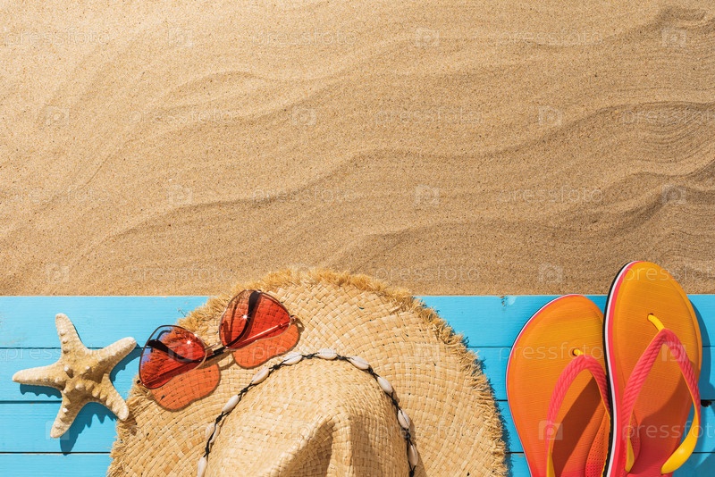 Соломенная шляпа, солнцезащитные очки, пляжные тапочки и морская звезда на деревянной подставке на фоне песка с копией пространства, летний фон