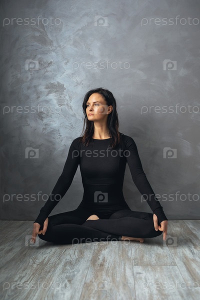 Женщина, практикующая йогу, медитирующая, сидя в позе лотоса, возле стены с абстрактным узором