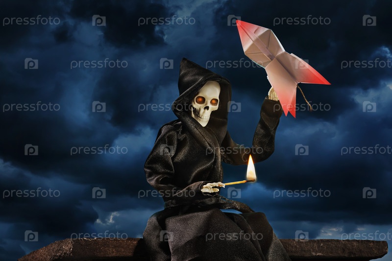 Скелет держит горящую спичку в одной руке и ядерную бомбу в другой. Концепция предотвращения войны