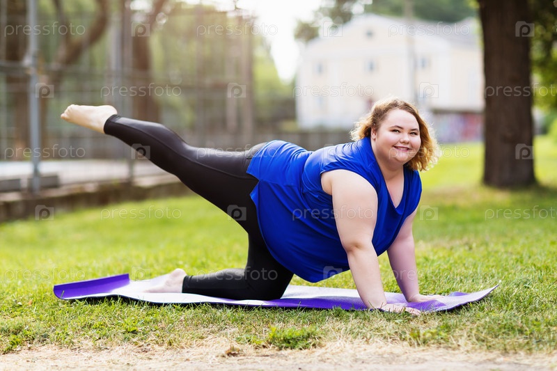 Молодая пухлая блондинка занимается спортом в парке. Концепция здорового образа жизни
