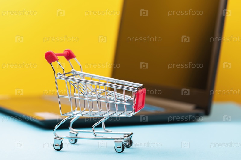 Игрушечная продуктовая корзина на фоне ноутбука, концепция на тему интернет-покупок