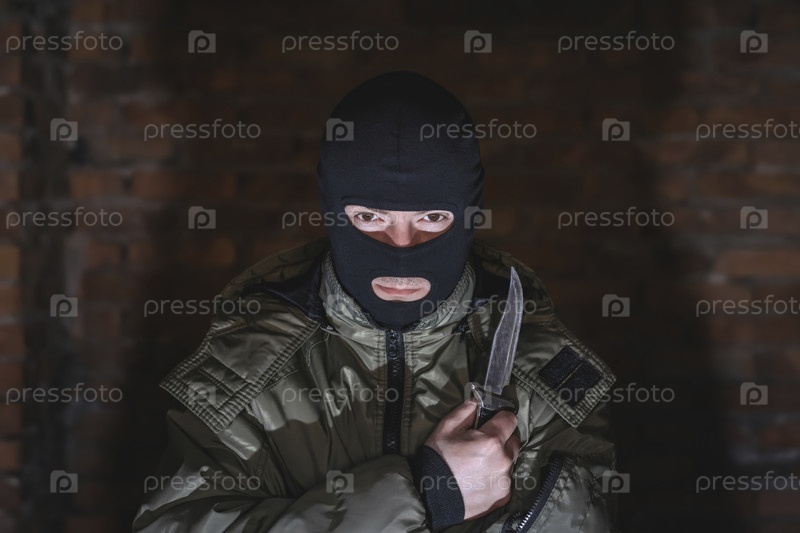 Опасный преступник в маске с ножом в темноте у кирпичной стены
