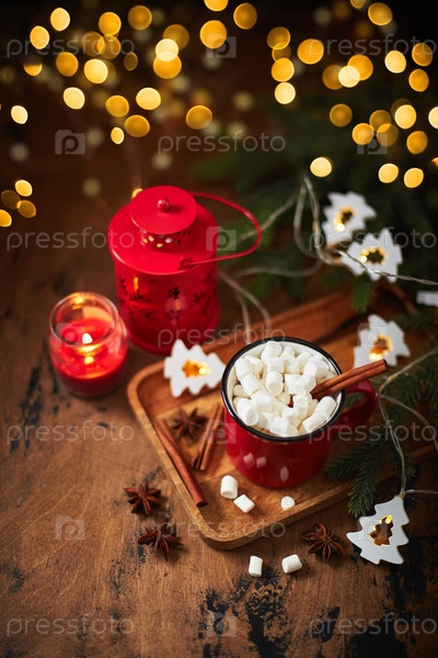 Красная чашка горячего какао с зефиром на деревянном столе с елкой и светящейся гирляндой на рождество