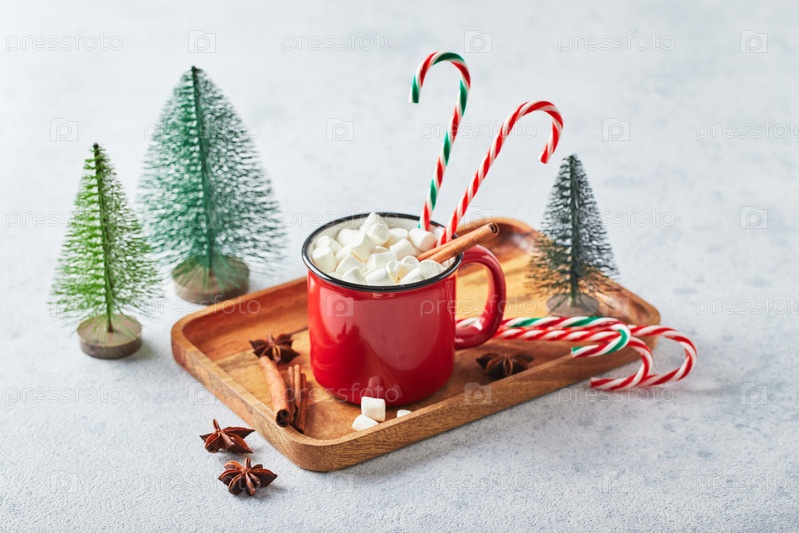 Красная чашка горячего какао с зефиром и леденцами на елке