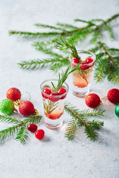 Алкогольный коктейль или безалкогольный коктейль с водкой и клюквой в кадрах с еловыми ветками на рождество