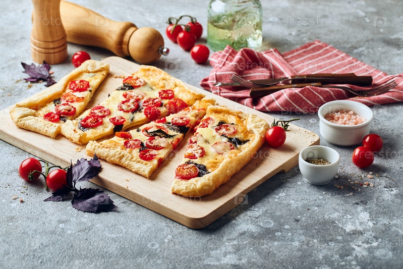 Пирог из слоеного теста с помидорами черри, моцареллой и фиолетовым базиликом
