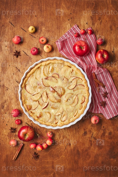 Домашний яблочный пирог со сметаной, красными яблоками, яблоками и корицей на деревянном фоне, вид сверху