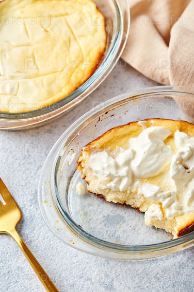 Вкусная творожная запеканка в порционных стеклянных формах со сметаной. Традиционная русская кухня на завтрак - запеканка