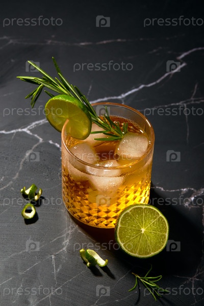 Алкогольный или безалкогольный коктейль с лаймом и розмарином на темном мраморном столе