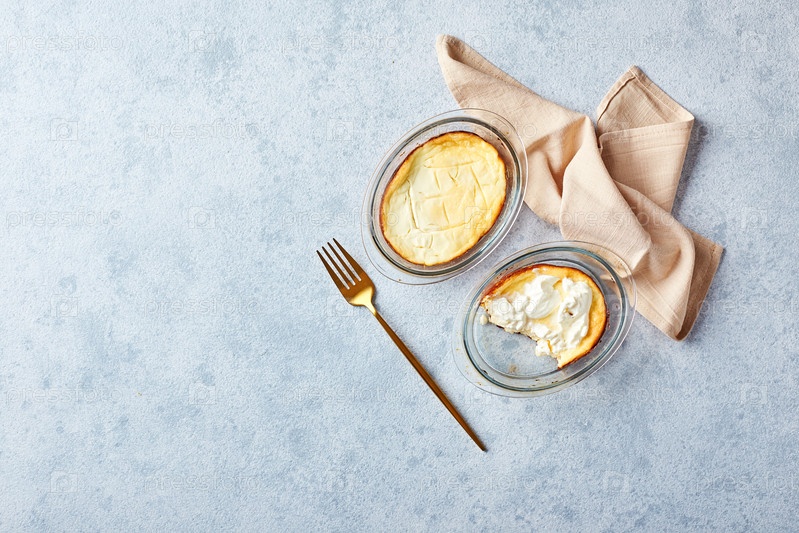 Вкусная творожная запеканка в порционных стеклянных формах со сметаной. Традиционная русская кухня на завтрак - запеканка
