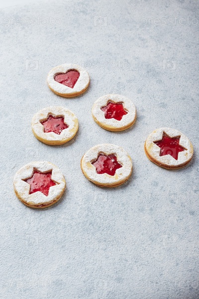 Классическое рождественское печенье Linzer с малиновым или клубничным джемом на светлом фоне