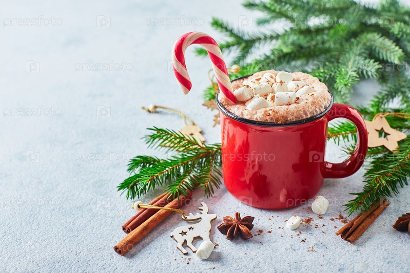 Красная чашка горячего какао с зефиром и леденцами на елке
