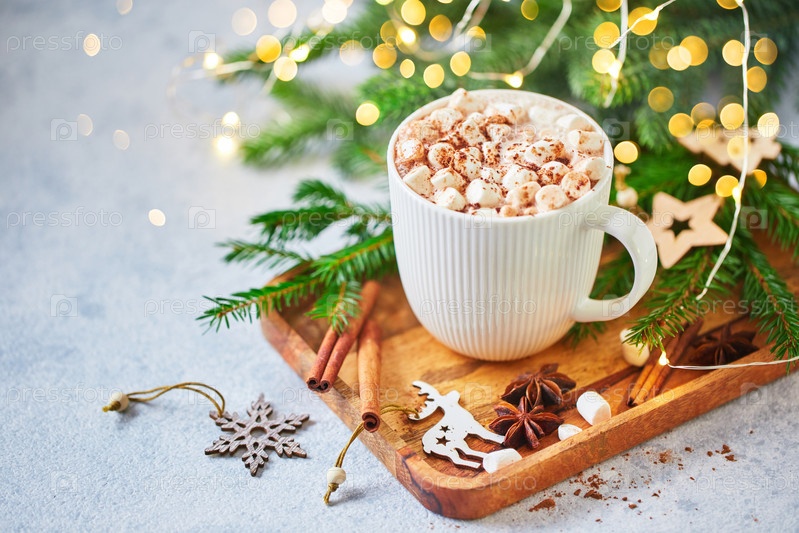 Чашка горячего какао с зефиром и леденцами на деревянном столе с елкой и светящейся гирляндой на рождество