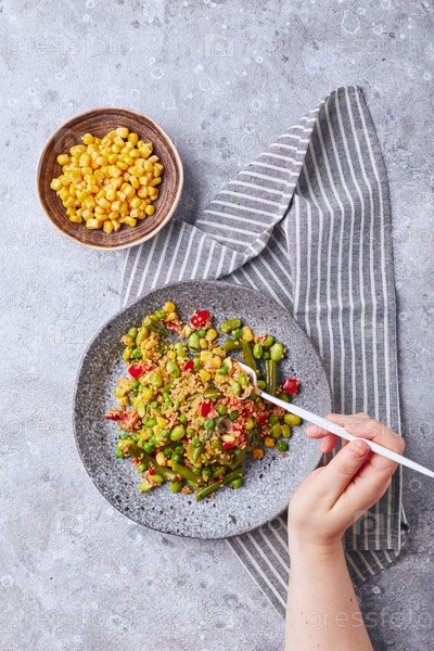 Салат из киноа с зеленой фасолью, кукурузой, красным перцем, горошком и соей. Полезная овощная смесь