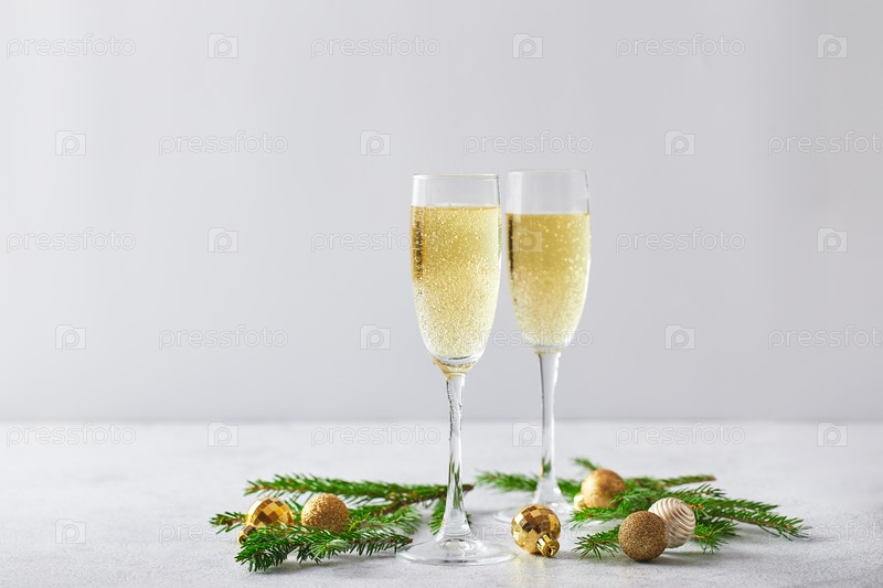 Бокалы с шампанским типа игристого вина с еловыми ветками и золотыми елочными украшениями на светлом фоне