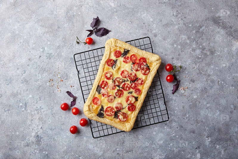 Пирог из слоеного теста с помидорами черри, моцареллой и фиолетовым базиликом