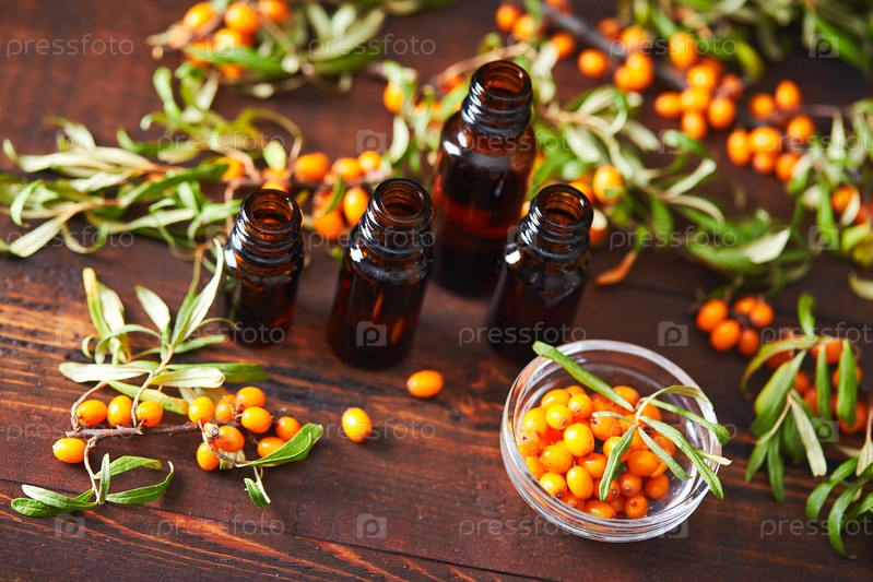 Стеклянная бутылка с ягодами облепихового масла и ветвями облепихи на деревянном фоне
