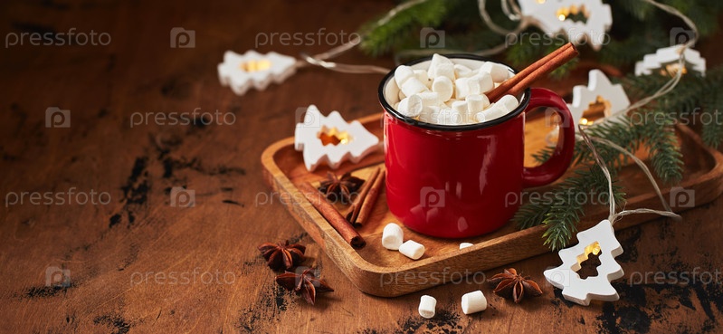 Красная чашка горячего какао с зефиром на деревянном столе с елкой на рождество