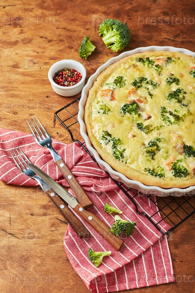 Домашний пирог с заварным кремом с красной рыбой, лососем, брокколи и сыром на деревянном фоне