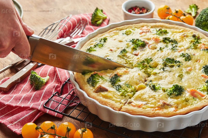 Домашний пирог с заварным кремом с красной рыбой, лососем, брокколи и сыром на деревянном фоне