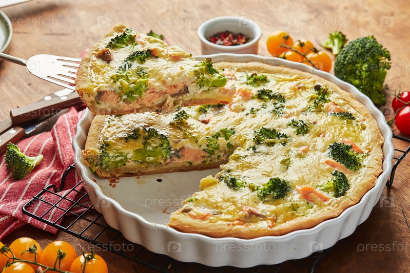 Домашний пирог с заварным кремом с красной рыбой, лососем, брокколи и сыром на деревянном фоне