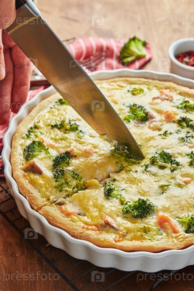 Домашний пирог с заварным кремом с красной рыбой, лососем, брокколи и сыром на деревянном фоне