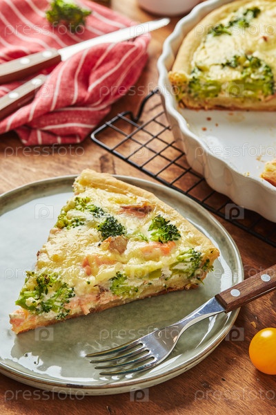 Домашний пирог с заварным кремом с красной рыбой, лососем, брокколи и сыром на деревянном фоне